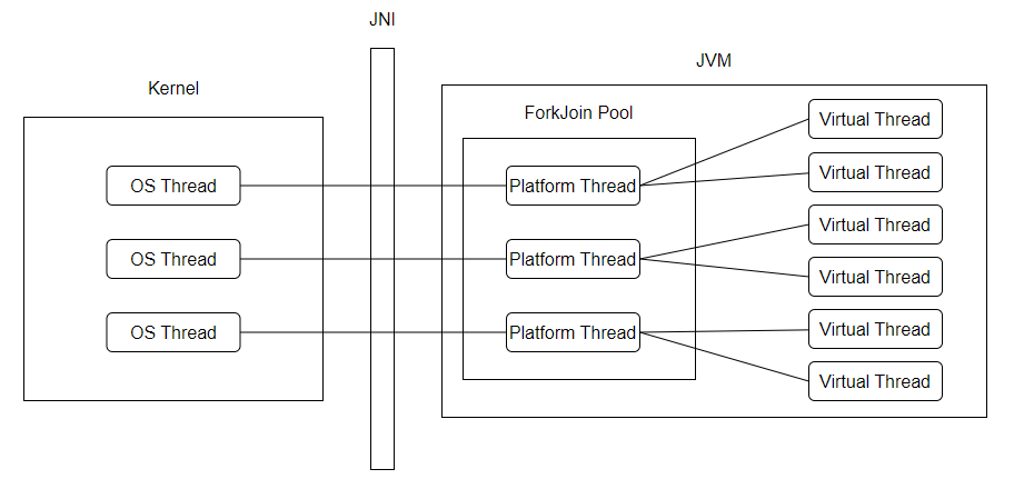 Virtual Thread는 위의 그림과 같은 구조로 사용할 수 있습니다.