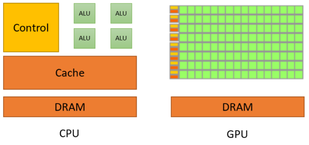 위의 그림을 보면 알 수 있듯이, CPU는 ALU의 개수가 적으나 강력한 구조를 가지고 있습니다.