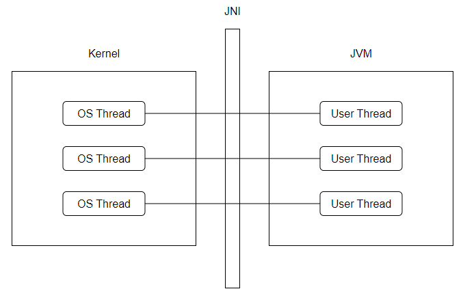 Java에서 Thread는 User Thread와 Kernel Thread가 1:1로 매칭됩니다.