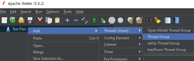 우측클릭을 하고, Add - Threads(Users) - Thread Group을 클릭하시면 새 창이 열립니다.