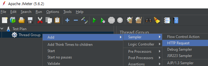 Spring의 HTTP Request를 테스트한다면, Thread Group을 우클릭하고 Add - Sampler - HTTP Request를 선택합니다.