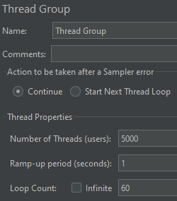 위의 설정으로 Jmeter를 실행한다면, 5000개의 Theads(users)들을 1초 내로 실행시키고, 60번 요청을 보내라는 것으로 해석할 수 있습니다.